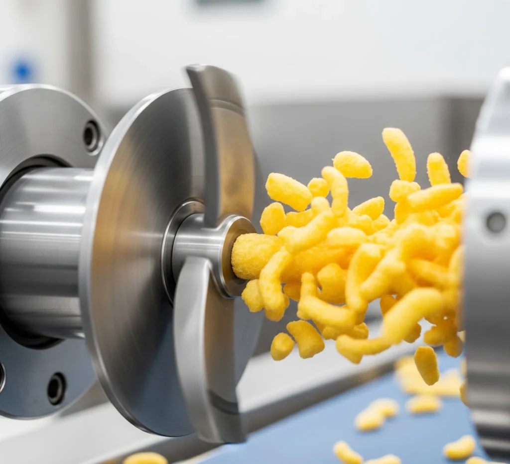 答案就在于高扭矩挤压和精密工程设计之间的精密协同作用。 膨化食品挤出机模具.通过使用单一的高性能 膨化食品机现在,制造商可以在 20 分钟内在 20 多种不同的零食形状之间切换,从简单的玉米卷到复杂的 3D 星形和空心枕头。
